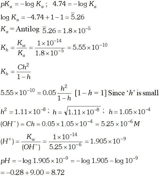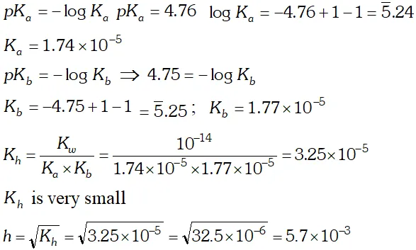 Q. The $p K_{b}$ of acetic acid and $p K_{a}$ of $N H_{4} O H$ are 4.76 and 4.75 respectively. Calculate the $K_{h}$ of $\mathrm{CH}_{3} \mathrm{COONH}_{4}$ at $298 K$ also the degree of the hydrolysis and $p H$ of its (a) $0.01 \mathrm{Mand}$ (b) $0.04 \mathrm{M}$