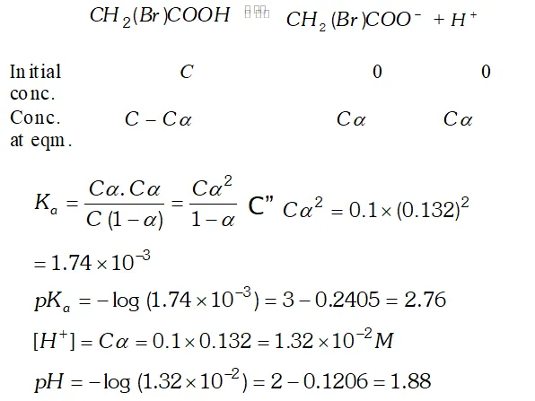 Q. The degree of ionization of a $0.1 M$ bromo acetic acid solution is $0.132 .$ Calculate the $p H$ of solution and the $p K_{a}$ of bromo acetic acid.