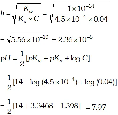 Q. The ionization constant of nitrous acid is $4.5 \times 10^{-4}$ Calculate the $p H$ of $0.04 M$ sodium nitrite solution and also its degree of hydrolysis.