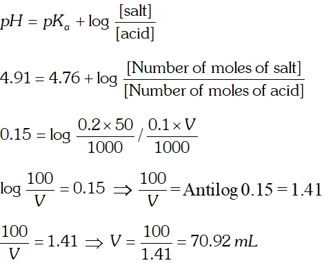 Q. How much volume of $0.1 \mathrm{MCH}_{3} \mathrm{COOH}[\mathrm{HAc}]$ should be added to $50 \mathrm{mL}$ of $0.2 \mathrm{M}$ NaAc (sodium acetate) solution if we want to prepare a buffer solution of $p H=4.91$