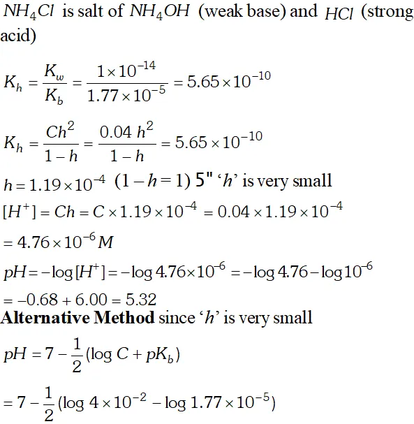 Q. $K_{b}$ for $N H_{4} O H$ is $1.77 \times 10^{-5}$ at $298 K .$ calculate the hydrolysis constant of $N H_{4} C l$ and $p H$ of $0.04 M N H_{4} C l$ solution.