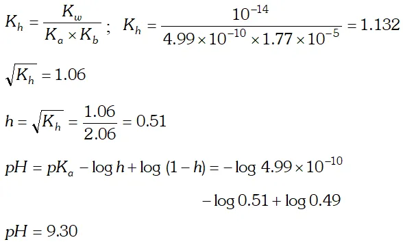 Q. Calculate the degree of hydrolysis and $p H$ of $0.02 M$ $N H_{4} C N$ solution at $298 K . K_{b}$ for $N H_{4} O H=1.77 \times 10^{5} K_{a}$ for $H C N=4.99 \times 10^{-10}$