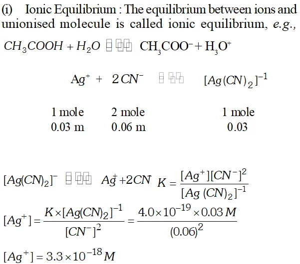 Q. (i) Define ionic equilibrium giving an example. (ii) For the reaction $\left[A g(C N)_{2}\right]^{-}$ E $\mathbb{E} \mathbb{Z} \quad A g^{+}+2 C N^{-}$ $K=4.0 \times 10^{-19}$ at $25^{\circ} \mathrm{C} .$ Calculate the silver ion concentration in a solution which was originally $0.10 M$ in $K C N$ and $0.03 M$ in $A g N O_{3}$