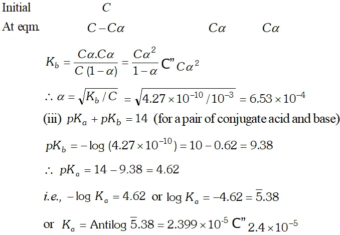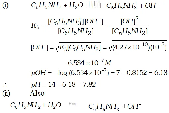 Q. What is the $p H$ of $0.001 M$ aniline solution? The ionization constant of aniline is $4.27 \times 10^{-10} .$ Calculate the degree of ionization of aniline in the solution. Also calculate the ionization constant of the conjugate acid of aniline.