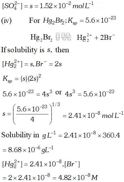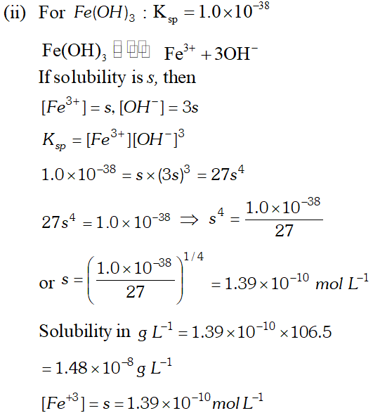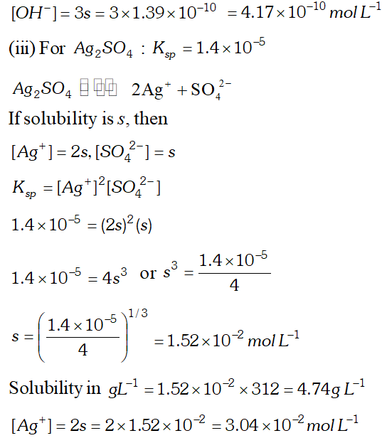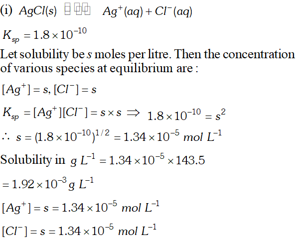 Q. Calculate the solubility of $A g C l, F e(O H)_{3}, A g_{2} S O_{4}$ and $H g_{2} B r_{2} \quad$ from $\quad$ their solubility products. $K_{s p}(A g C l)=1.8 \times 10^{-10}, \quad K_{s p}\left[F e(O H)_{3}\right]=1.0 \times 10^{-38}$ $K_{s p}\left[A g_{2} S O_{4}\right]=1.4 \times 10^{-5}, \quad K_{s p}\left(H g_{2} B r_{2}\right)=5.6 \times 10^{-23}$ Also calculate the solubilities of salts in $g L^{-1}$ and molarities of the ions.