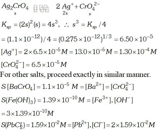 Q. Determine the solubilities of silver chromate, barium chromate, ferric hydroxide, lead chloride and mercurous iodide at $298 \mathrm{K.~Given~} K_{s p}$ values: $A g_{2} C r O_{4}=1.1 \times 10^{-12}, B a C r O_{4}=1.2 \times 10^{-10}, F e(O H)_{3}$ $=1.0 \times 10^{-38}$ $P b C l_{2}=1.6 \times 10^{-5}, H g_{2} I_{2}=4.5 \times 10^{-29}$ Determine also the molarities of individual ions.