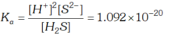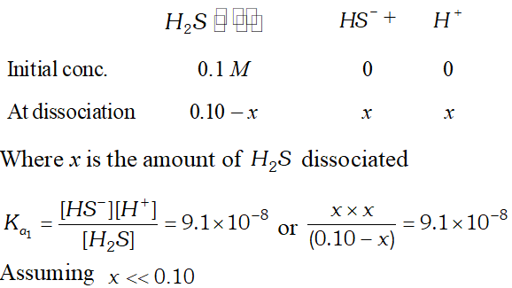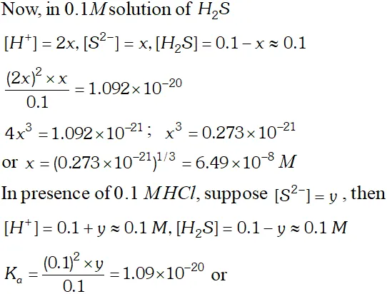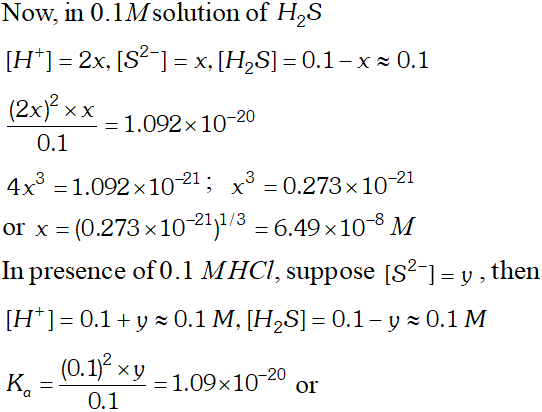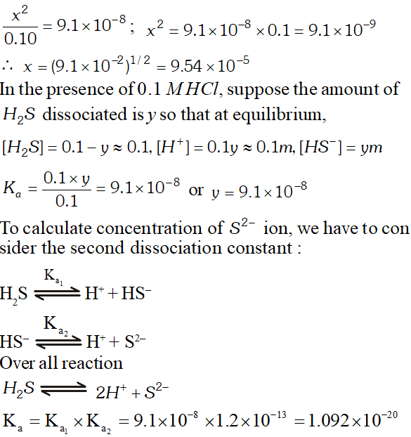 Q. The first ionization constant of $H_{2} S$ is $9.1 \times 10^{-8} .$ Calculate the concentration of $H S^{-}$ ion is its $0.1 M$ solution. How will this concentration be effected if the solution is $0.1 M H C l$ also. If the second dissociation constant of $H_{2} S$ is $1.2 \times 10^{-13}$, calculate the concentration of $S^{-2}$ ion under these conditions.
