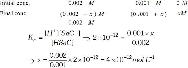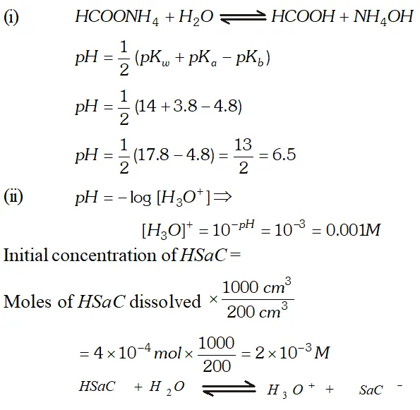 Q. (i) Calculate $p H$ of an aqueous solution of $1.0 \mathrm{M}$ ammonium formate assuming complete dissociation. $\left(p K_{a} \text { of } H C O O H=3.8 \text { and } p K_{b} \text { of } N H_{3}=4.8\right)$ (ii) Saccharine $\left(K_{a}=2 \times 10^{-12}\right)$ is a weak acid represented by formula Hsac. $4 \times 10^{-4} \mathrm{mol}$ of saccharine is dissolved in $200 \mathrm{cm}^{3}$ water $p H=3 .$ Assuming no change in volume, calculate the concentration of $S a c^{-}$ ion in resulting solution.