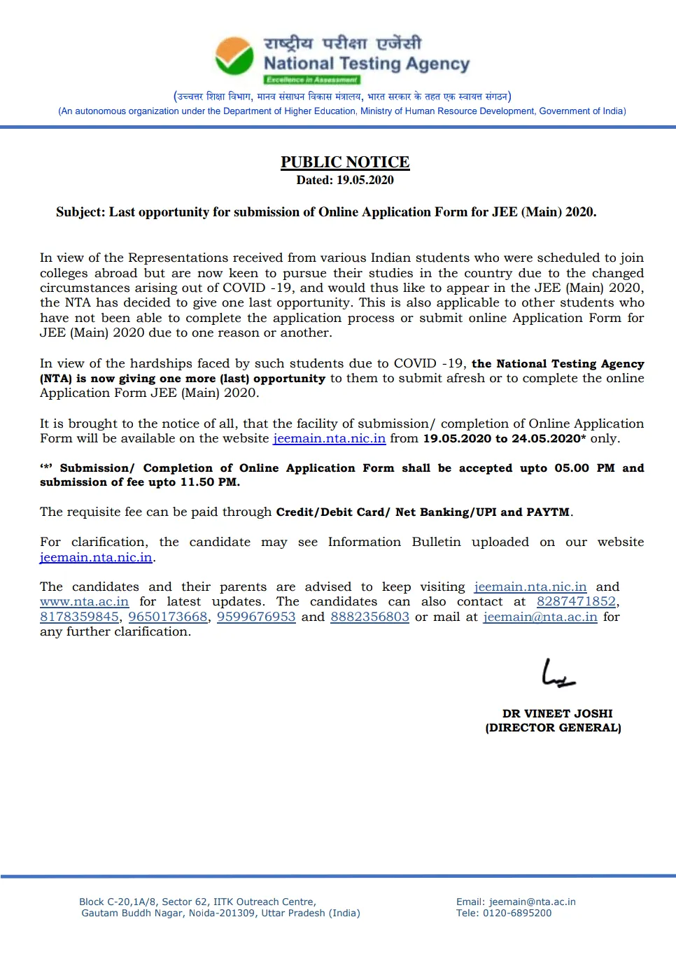 Public Notice by NTA regarding JEE MAIN 2020 Application Process