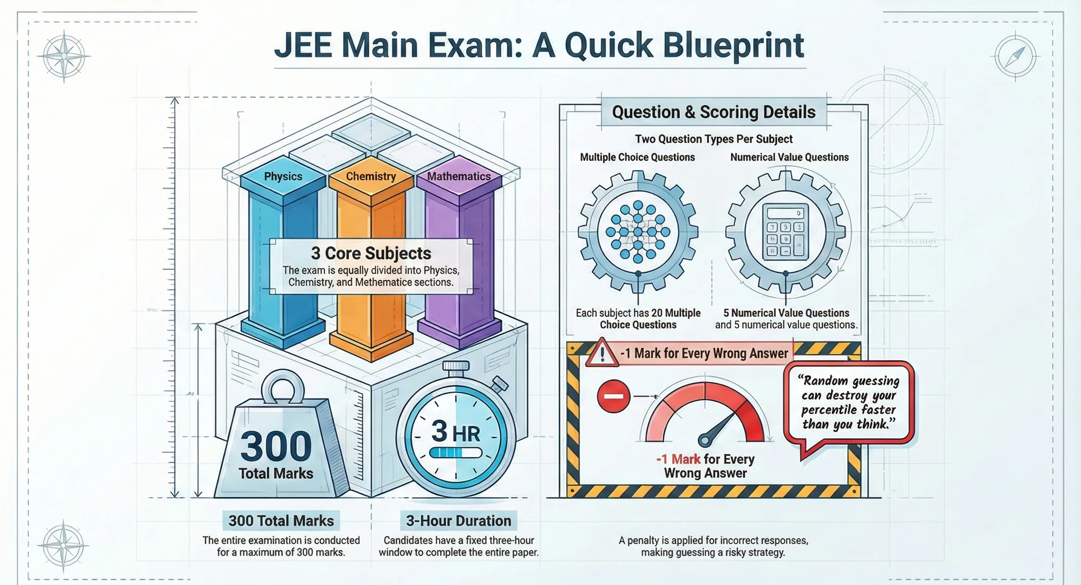Here's the truth: The 3-hour JEE Main carries 300 marks and follows a rigid structure across Physics, Chemistry, and Mathematics. Each subject hits you with 20 Multiple Choice Questions in Section A plus 5 numerical value questions in Section B. Every wrong answer costs you -1 mark, which means random guessing can destroy your percentile faster than you think.
