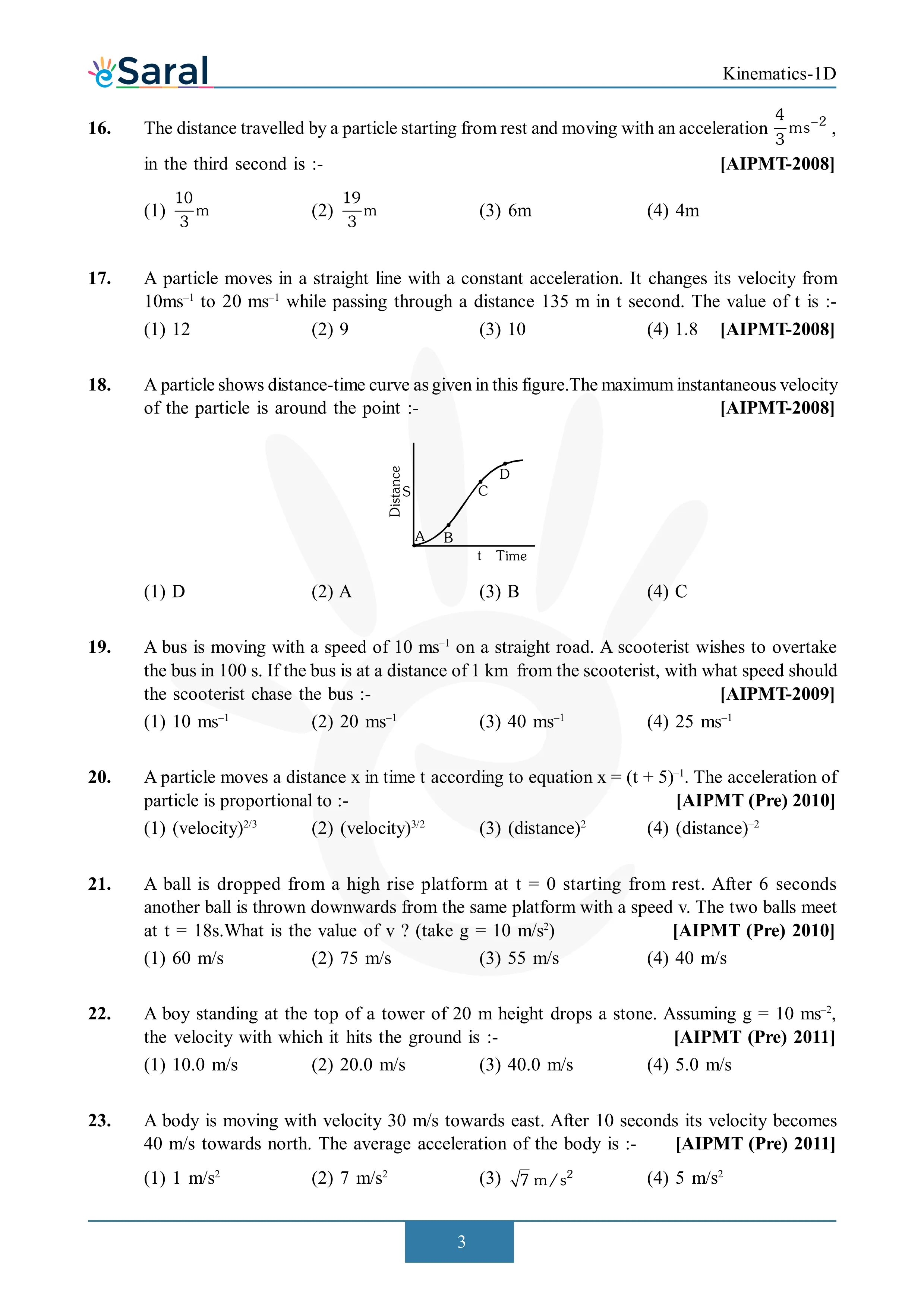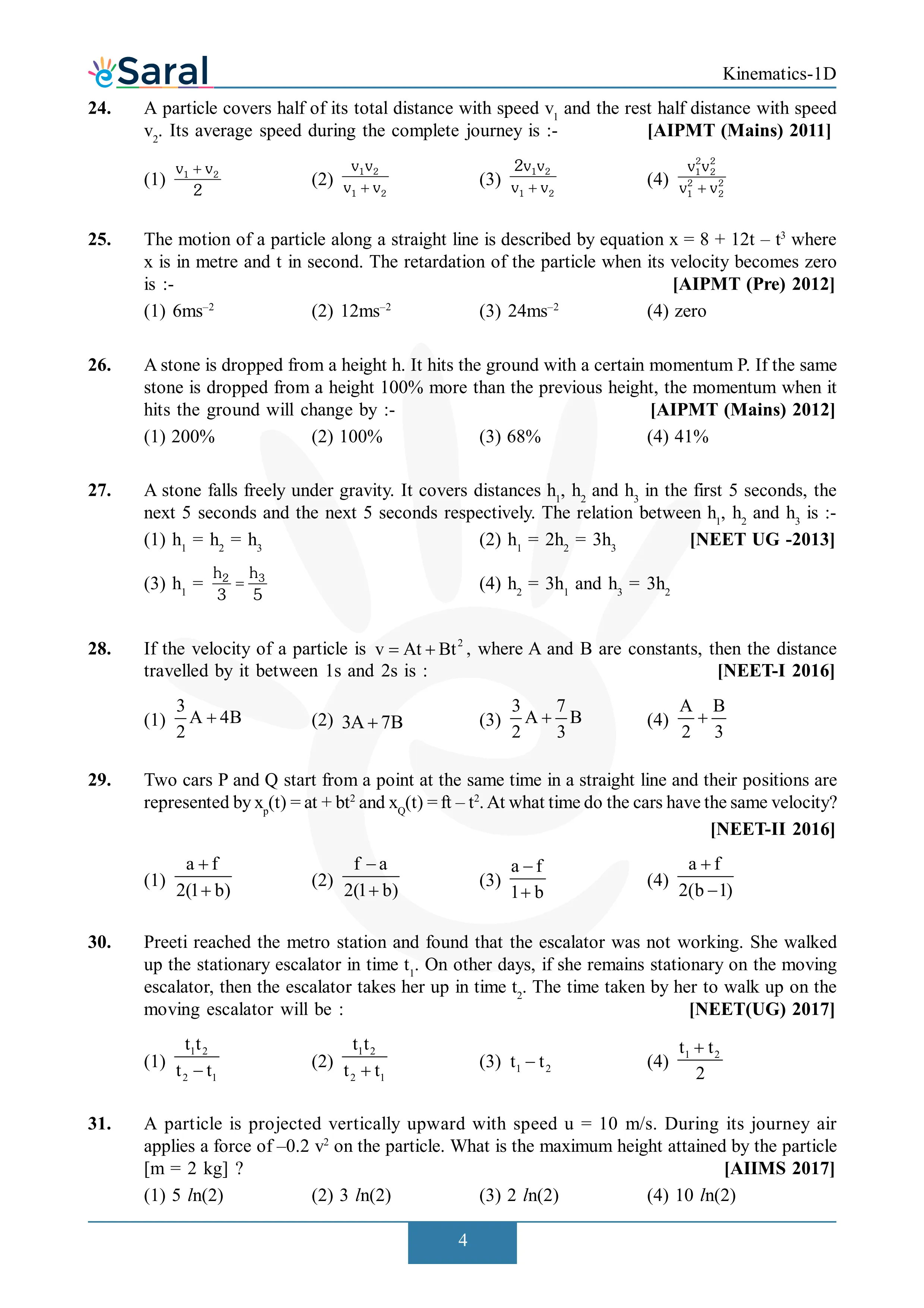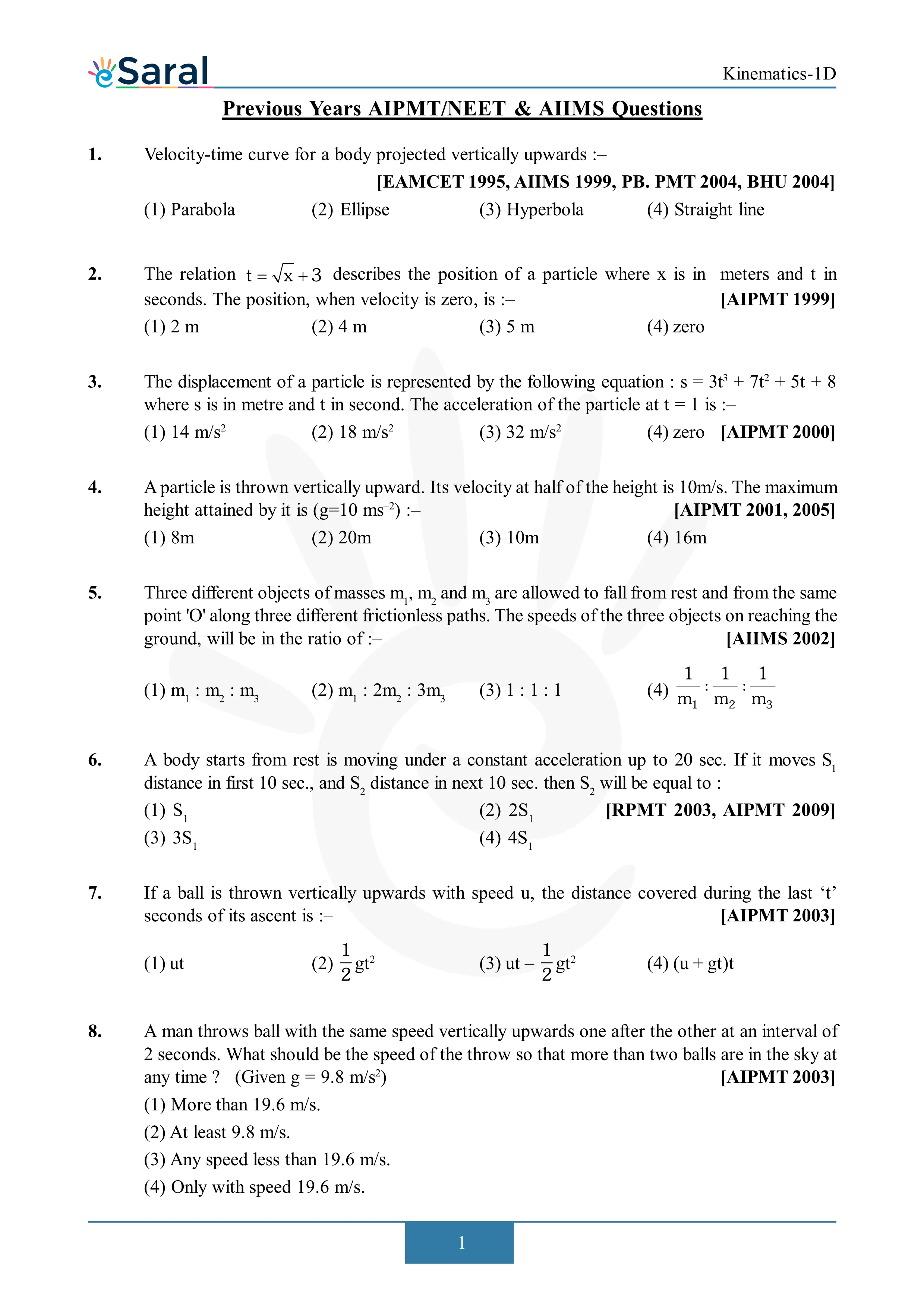 JEE Mains & AdvancedHere you will get Complete Kinematics 1D NEET Previous Year Questions with complete and detailed solutions. Get complete NEET previous year questions for Physics, Chemistry and Biology. You will find all the solutions at the end of this page: