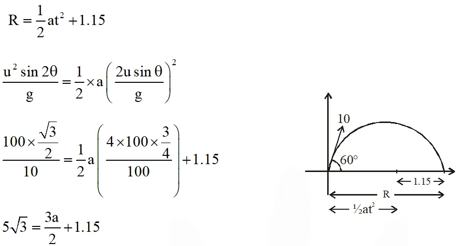 Q. A train is moving along a straight line with a constant acceleration ‘a’. A boy standing in the train throws a ball forward with a speed of 10 m/s, at an angle of $60^{\circ}$ to the horizontal. The boy has to move forward by 1.15 m inside the train to catch the ball back at the initial height. The acceleration of the train, in $\mathrm{m} / \mathrm{s}^{2}$, is -