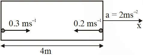 Q. A rocket is moving in a gravity free space with a constant acceleration of 2 $\mathrm{ms}^{-2}$along + x direction (see figure). The length of a chamber inside the rocket is 4m. A ball is thrown from the left end of the chamber in + x direction with a speed of 0.3 $\mathrm{ms}^{-1}$ relative to the rocket. At the same time, another ball is thrown in –x direction with a speed of 0.2 $\mathrm{ms}^{-1}$ from its right end relative to the rocket. The time in seconds when the two balls hit each other is -