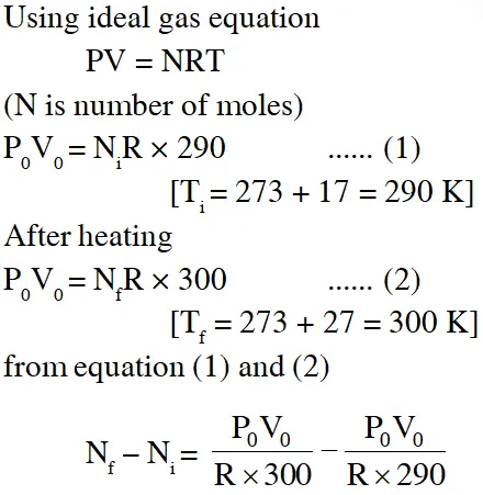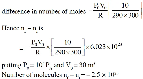 Q. The temperature of an open room of volume $30 \mathrm{m}^{3}$ increases from $17^{\circ} \mathrm{C}$ to $27^{\circ} \mathrm{C}$ due to sunshine. The atmospheric pressure in the room remains $1 \times 10^{5} \mathrm{Pa} .$ If $\mathrm{n}_{1}$ and $\mathrm{n}_{\mathrm{f}}$ are the number of molecules in the room before and after heating, then $\mathrm{n}_{\mathrm{f}}-\mathrm{n}_{\mathrm{i}}$will be :-