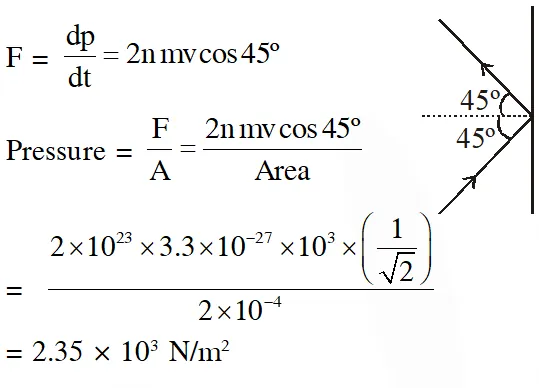 Q. The mass of a hydrogen molecule is $3.32 \times 10^{-27} \mathrm{kg} .$ If $102^{23}$ hydrogen molecules strike, per second, a fixed wall of area 2 cm2 at an angle of $45^{\circ}$ to the normal, and rebound elastically with a speed of $10^{3}$ m/s, then the pressure on the wall is nearly :