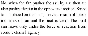 Q. Air is thrown on a sail attached to a boat from an electric fan placed on the boat. Will the boat start moving?.