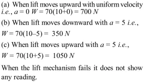Q. A man weights 70 kg. He stands on a weighting scale in a lift which is moving. (a) Upward with a uniform speed of $10 \mathrm{ms}^{-1}$. (b) Downward with a uniform acceleration of $5 \mathrm{ms}^{-2}$ with a uniform acceleration of (c) Upward with a uniform acceleration of $5 \mathrm{ms}^{-2}$. What would be the reading on the scale in each case? What would be the reading if the lift mechanism failed, and it hurtled down freely under gravity? $\left[g=10 \mathrm{ms}^{-2}\right]$