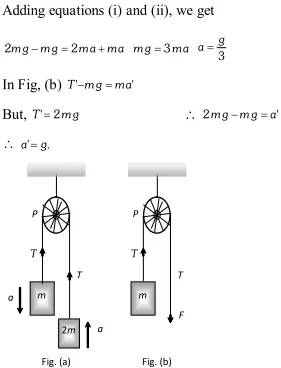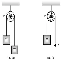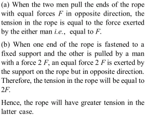 Q. In which case will a rope have the greater tension (a) Two men pull the ends of the rope with forces $F$ equal in magnitude but opposite in direction. (b) One end of the rope is fastened to a fixed support and the other is pulled by a man with a force $2 F .$