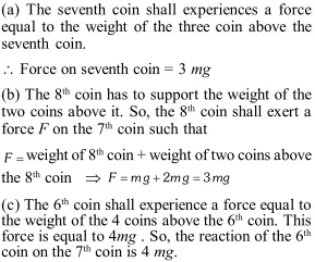 Q. Ten one-rupee coins are put on the top of eachother on a table. Each coin has a mass $m$ kg. Give the magnitude and direction of (a) The force on the $7^{\text {th }} \operatorname{coin}$ (counted from the bottom) due to all the coins on its top (b) The force on the $7^{\text {th }}$ coin by the eighth coin (c) The reaction of the $6^{\text {th }}$ coin on the $7^{\text {th }}$ coin [NCERT]