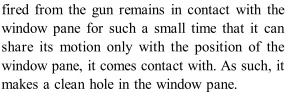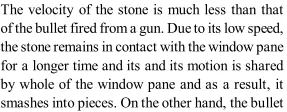 Q. A stone when thrown on a glass window smashes the window pane to piece, but a bullet from the gun passes through making a clean hole. Why?