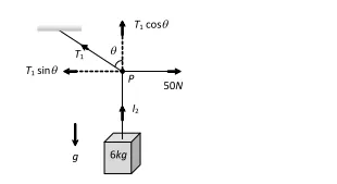 Q. A mass of $6 \mathrm{kg}$ is suspended by a rope of length $2 \mathrm{m}$ from a ceiling. A force of $50 \mathrm{N}$ in the horizontal direction is applied at the mid-point of the rope, as shown in the figure. What is the angle that rope makes with the vertical in equilibrium? Neglect the mass of the rope. Given : $\mathrm{g}=10 \mathrm{ms}^{-2}$. [NCERT]