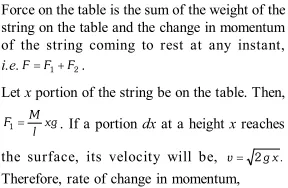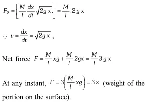 Q. A piece of uniform string hangs vertically, so that its free end just touches the horizontal surface of a table. If the upper end is released, show that at any instant during fall of the string, the total force on the surface is three times the weight of that part of the string which is lying on the surface. [NCERT]