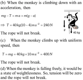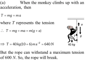Q. A monkey of mass 40 kg climbs on a rope which can withstand a maximum tension of $600 N .$ In which of the following cases will the rope break: the monkey (a) Climbs up with an acceleration of $6 \mathrm{ms}^{-2}$ (b) Climbs down with an acceleration of $4 \mathrm{ms}^{-2}$ (c) Climbs up with a uniform speed of $5 \mathrm{ms}^{-1}$ (d) Falls down the rope nearly freely under gravity Take $g=10 \mathrm{ms}^{-2}$. Ignore the mass of the rope. [NCERT] (new)