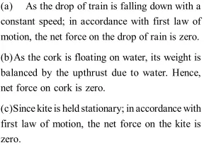 Q. Give the magnitude and direction of the net force acting on (a) A drop of rain falling down with a constant speed (b) A cork of mass 10 g floating on water (c) A kite skilfully held stationary in the sky (d) A car moving with a constant velocity of $30 \mathrm{km}$ (e) A high-speed electron in space far from all gravitating objects and free of electric and magnetic fields.