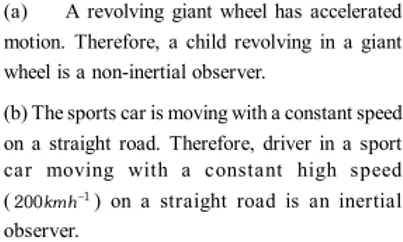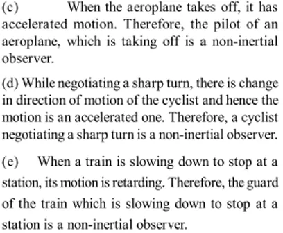 Q. For ordinary terrestrial experiments, which of the observers below are inertial and which non-inertial? (a) A child revolving in a "giant wheel" (b) A driver in a sport car moving with a constant high speed of $200 \mathrm{km} \mathrm{h}^{-1}$ on a straight road, (c) The pilot of an aeroplane which is taking off, (d) A cyclist negotiating a sharp turn, (e) The guard of a train which is slowing down to stop at a station? [NCERT]
