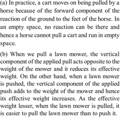 Q. Explain, why (a) A horse cannot pull a cart and run in empty space. (b)Is it easier to pull a lawn mower than to push it (c) Does a cricketer move his hands backward when holding a catch.
