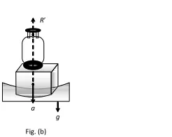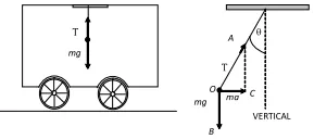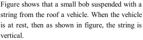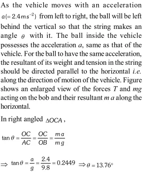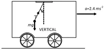 Q. A light string carrying a small bob hangs from the roof of a vehicle as shown in the figure. If the vehicle moves in a horizontal straight line with a constant acceleration of $2.4 \mathrm{ms}^{-2}$ from left to right, determine the angle, which the string makes with the vertical.
