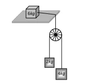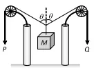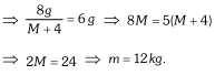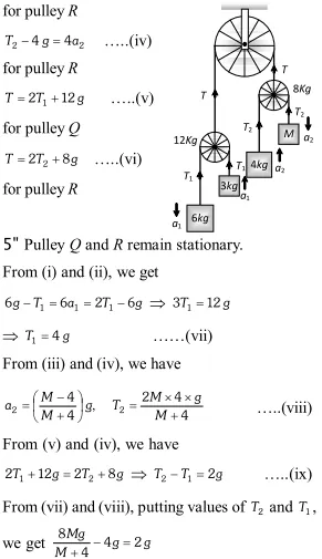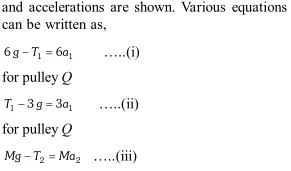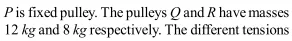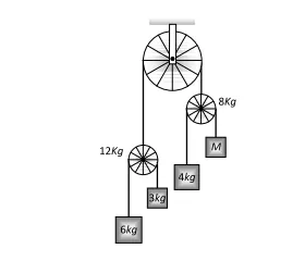Q. Two pulley of masses $12 \mathrm{kg}$ and $8 \mathrm{kg}$ are $\mathrm{d} \mathrm{e}$ connected by a fine string hanging over a fixed pulley as shown. Over the latter is hung a fined string with masses $4 \mathrm{kg}$ and $M .$ Over the $12 \mathrm{kg}$ pulley is hung another fine string with masses 3 $\mathrm{kg}$ and $6 \mathrm{kg}$. Calculate $M$ so that the string overthe fixed pulley remains stationary.