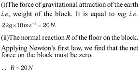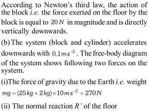 Q. A wooden block of mass 2 kg rests on a soft horizontal floor. When an iron cylinder of mass $25 \mathrm{kg}$ is placed on top of the block, the floor yields steadily and the block and the cylinder together go down with an acceleration of $0.1 \mathrm{ms}^{-2}$. What is the action of the block on the floor (a) before and (b) after the floor yields? Take $\mathrm{g}=10 \mathrm{ms}^{-2}$. [NCERT]