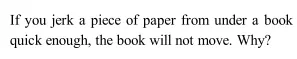 Q. If you jerk a piece of paper from under a book quick enough, the book will not move. Why?