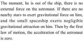 Q. An astronaut accidentally gets separated out of his small spaceship accelerating in inter-stellar space at a constant rate of . What is the acceleration of the astronaut the instant after the is outside the spaceship?