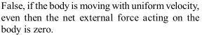 Q. If a body is not at rest, the net external force acting on it cannot be zero. Is it true or false?