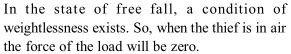 Q. A thief jumps from the upper storey of a house with a load on his back. What is the force of the load on his back when the thief is in air?