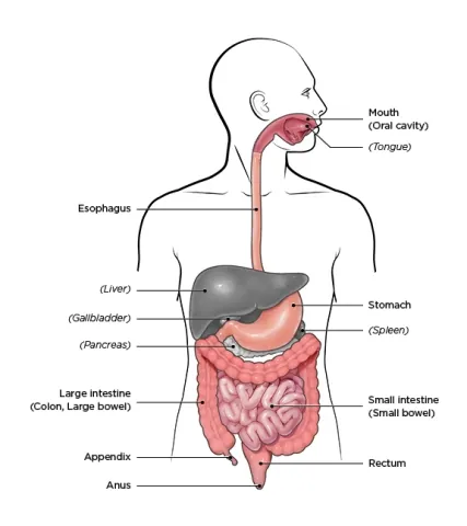 - It starts with the mouth and ends with the anus.
