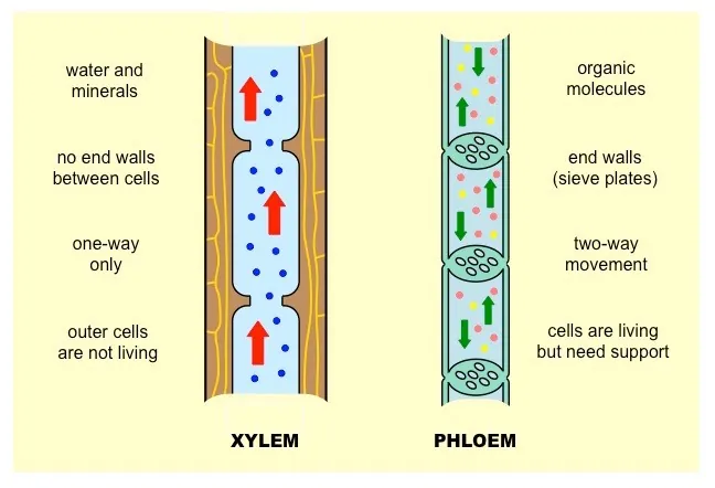 | Components | Sieve tube elements, companion cells, phloem fibers, phloem parenchyma | Tracheids, vessels, xylem fibers, xylem parenchyma |