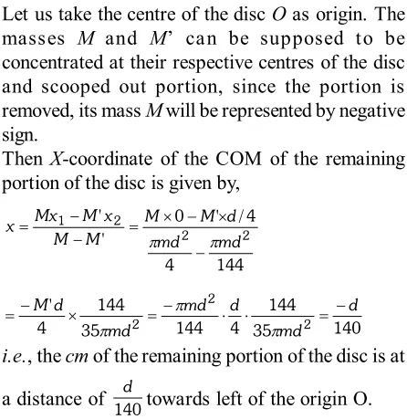 Q. From a uniform circular disc of diameter $d,$ a circular hole of diameter $\mathrm{d} / 6$ and having its centre at a distance of $\mathrm{d} / 4$ from the centre of the disc is scoped out. Find the centre of mass of the remaining portion.