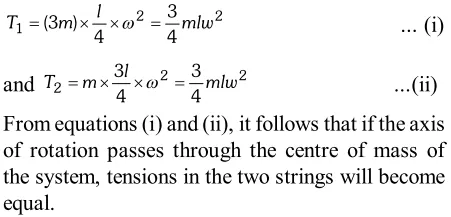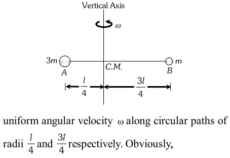 Q. (a) Two balls of masses $3 m$ and $m$ are separated by a distance $l .$ Find the position of the centre of mass. (b) If these two balls are attached to a vertical axis by means of two threads whose combined length is $l$ and rotated in a horizontal plane with uniform angular velocity $\omega$ about an axis of rotation passing $\mathrm{g}$ in the $\mathrm{g}$ in the through centre of mass, prove that tensions in the two strings will become equal.