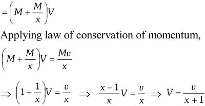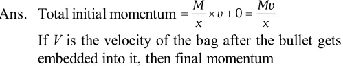 Q. A bag of sand of mass $M$ is hanging from a rope. A bullet of mass $\frac{\mathrm{M}}{\mathrm{x}}$ is fired at it with a velocity $v .$ The bullet gets embedded into the bag. What is the velocity of the bag after the bullet gets embedded into it?