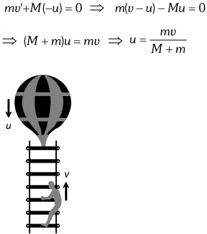 Ans. Initially, when the man stands on the rope-ladder, the system (man, balloon and rope-ladder) is at rest i.e. initial momentum of the system is zero. When the man climbs up the ladder, the force acting on the balloon and rope-ladder is an internal force.Therefore, total momentum of the system should still remain zero. Since man is climbing up, the balloon and the rope-ladder would descend. Let $u$ be the velocity of the balloon and rope-ladder w.r.t. earth in downward direction, when the man starts climbing up. Since velocity of the man w.r.t the earth, $v^{\prime}=v-u$ According to the principle of conservation of momentum,