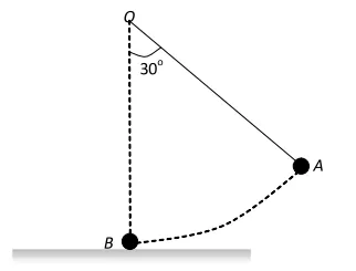 Q. The bob A of a simple pendulum released from $30^{\circ}$ to the vertical hits another bob $\mathrm{B}$ of the same mass at rest on a table as shown in figure. How high does the bob A rise after the collision? Neglect the size of the bobs and assume the collision to be