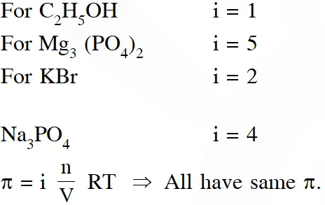 Q. Consider separate solution of $0.500 \mathrm{M} \mathrm{C}_{2} \mathrm{H}_{5} \mathrm{OH}(\mathrm{aq}), 0.100 \mathrm{MM} \mathrm{g}_{3}\left(\mathrm{PO}_{4}\right)_{2}(\mathrm{aq}), 0.250 \mathrm{M} \mathrm{KBr}(\mathrm{aq})$ and 0.125 M $\mathrm{Na}_{3} \mathrm{PO}_{4}(\mathrm{aq})$ at $25^{\circ} \mathrm{C}$. Which statement is true about these solutions, assuming all salts to be strong electrolytes ?
