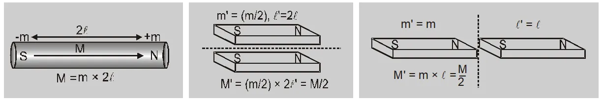 - If a magnet is cut into two equal parts along the length then pole strength is reduced to half and length remains unchanged.New magnetic dipole moment M' = m' $(2 \ell)=\frac{ m }{2} \times 2 \ell=\frac{ M }{2}$The new magnetic dipole moment of each part becomes half of the original value.