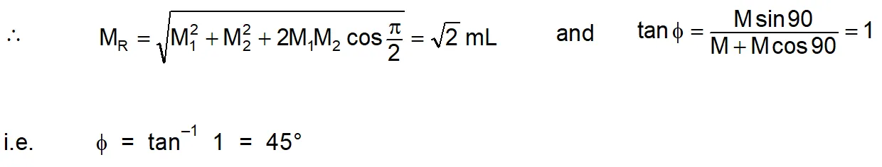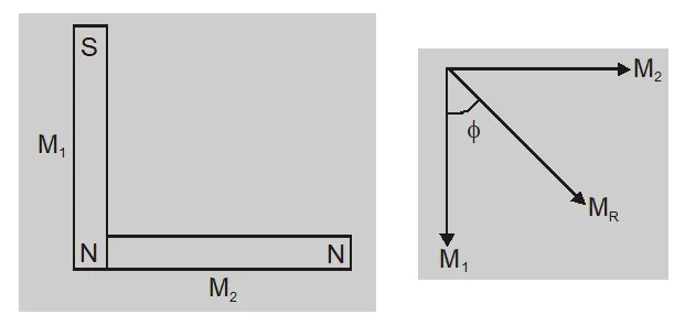- As the magnetic moment is a vector, in the case of two magnets having magnetic moments $M_{1}$ and $M_{2}$ with angle $\theta$ between them, the resulting magnetic moment. $M =\left[ M _{1}^{2}+ M _{2}^{2}+2 M _{1} M _{2} \cos \theta\right]^{1 / 2}$ with $\tan \phi=\left[\frac{M_{2} \sin \theta}{M_{1}+M_{2} \cos \theta}\right]$
