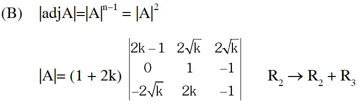 (B) Let $\mathrm{k}$ be a positive real number and let $\mathrm{A}=\left[\begin{array}{ccc}{2 \mathrm{k}-1} & {2 \sqrt{\mathrm{k}}} & {2 \sqrt{\mathrm{k}}} \\ {2 \sqrt{\mathrm{k}}} & {1} & {-2 \mathrm{k}} \\ {-2 \sqrt{\mathrm{k}}} & {2 \mathrm{k}} & {-1}\end{array}\right]$ and