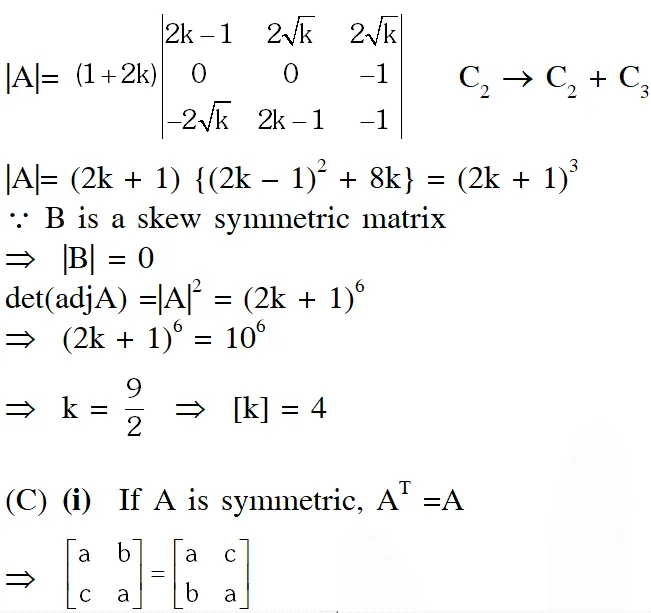 $\mathrm{B}=\left[\begin{array}{ccc}{0} & {2 \mathrm{k}-1} & {\sqrt{\mathrm{k}}} \\ {1-2 \mathrm{k}} & {0} & {2 \sqrt{\mathrm{k}}} \\ {-\sqrt{\mathrm{k}}} & {-2 \sqrt{\mathrm{k}}} & {0}\end{array}\right]$