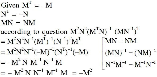 Q. Let $\mathrm{M}$ and $\mathrm{N}$ be two $3 \times 3$ non-singular skew-symmetric matrices such that $\mathrm{MN}=\mathrm{NM}$. If $\mathrm{P}^{\mathrm{T}}$ denotes the transpose of $\mathrm{P},$ then $\mathrm{M}^{2} \mathrm{N}^{2}\left(\mathrm{M}^{\mathrm{T}} \mathrm{N}\right)^{-1}\left(\mathrm{MN}^{-1}\right)^{\mathrm{T}}$ is equal to –